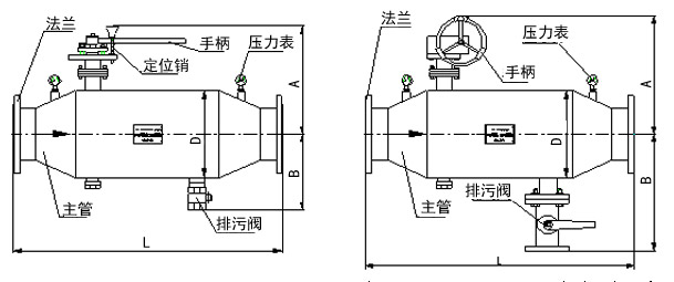 | 型號 | 公稱通徑 | 最大流量 | L(mm) | A | B | D | 排污口 | 重量Kg | |||||